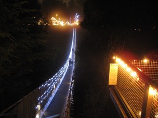 If you’ve been to Vancouver you’ll know that this is a big tourist attraction.  It’s a wobbly bridge that is 450 feet long and 270 feet high.  Generally I’m terrified of it.  During peak hours it’s not fun (for me) at all – the bridge swings back and forth; teenagers/tourists try on purpose (!) to make it move.  But when it’s dark and there are very few people on it it’s not too bad.  I did have to hang on to Colin’s jacket though.  Once you cross the bridge there are mini suspension bridges between the trees – thankfully they don’t move too much.  It was nice to play tourist in my own city for once.