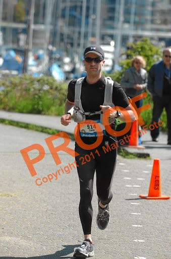 I can’t say too much about the next few kilometres of the race. It’s the same route that a summer half marathon runs along so I’d done it before. I knew what to expect in terms of hills, etc. I walked a lot of it. There were a few runners I kept leap-frogging along here and a few that looked like they might want to give up soon. I had a nice conversation with a guy on a bike. Crowd support was sporadic, but the people that were out were still awesome and supportive. I came to the Burrard bridge (slight incline, nothing like the hill at UBC) and walked. I knew there would be a photographer at the end of the bridge so I made the effort to at least look like I was moving at more than a walking pace. I ran to the next aid station out of pure vanity. My legs hurt with every step, but only one lane was closed so there was oncoming traffic. Someone cheered for me by name, which freaked me out a bit because I wondered if I knew them duh, name on bib remember?. Finally I was at the turn down onto the seawall and I knew that I only had about 10km left.