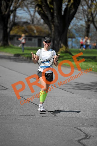 It was at this point that I picked up a running partner. I was running alongside a girl who had just found $5 in the gutter (someone probably wondered where their bus fare went later) and we got to chatting. I asked if she wanted to run together for a while. It was her first marathon and she seemed up to having company at that point. We ran together down the hill out of UBC and eventually came to the 21km mark. This part was a little weird. We were shifted off the road into a large parking lot, taken past an aid station, turned back to run over the timing mats, and then out the entrance we just came in. I know they probably had to add distance to the course at some point and that it’s an odd area to put an aid station on the road (not very wide), but it was awkward. And kind of demoralizing since forward progress was detoured… I said goodbye to the girl I was running with at that point since my legs were so tired and I didn’t want to hold her back. I hope she had a good second half!