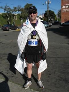 The last 10km was flat and winding on the seawall around Stanley Park. The problem was that there was always just one more corner… It’s beautiful, though, which at points was it’s only saving grace. I was again leap-frogging the same runners. I chatted with a few; I asked if others were okay. I knew that I would have no problem getting my medal since there was an 8 hour time limit. I tried to do a jump for a photographer at one point, but only one leg lifted off the ground – my brain obviously kept the other one firmly on the ground out of self-preservation! Even though I was moving so slowly I was thrilled when I came to the final stretch (not so thrilled that it was slightly up hill). I knew that I was close to 6 hours (chip) and I really didn’t want to go over. A woman came up behind me and said she’d been trying to catch me for a while. She passed me by a few steps and then I decided that I couldn’t let her beat me. I’m sure I looked ridiculous trying to hobble-sprint, but I did beat her as there was a very tiny downhill to the finish line. Apparently Colin cheered for me at that point, but I didn’t hear him. I cheered for myself with my hands up because I finished my 3rd marathon!