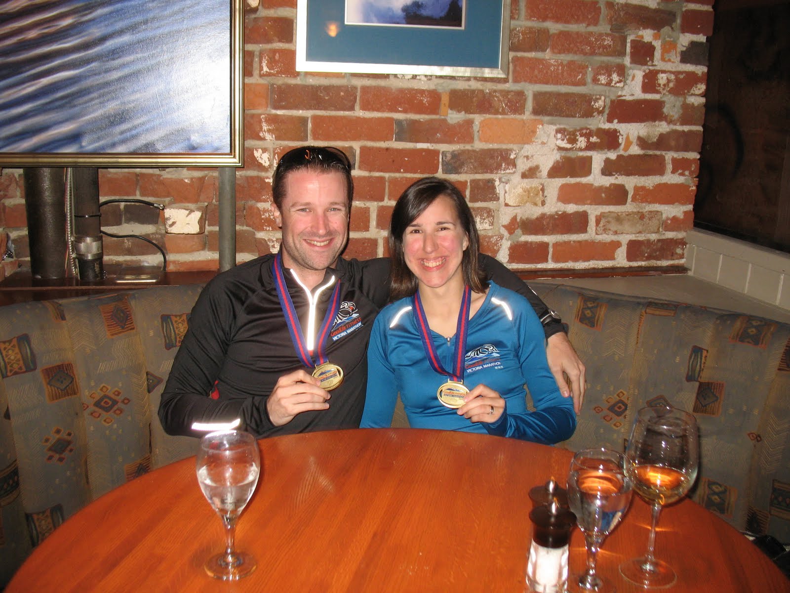 Once I was over the line I got my medal, had a couple of pictures taken, and grabbed my bag lunch (so NOT hungry). The bike guy from earlier stopped by to say congratulations. I met up with Colin and asked how he did. While I may have ended the day with a PW I’m proud to say he finished in 3:42:11 – a 10:42 PR!! We celebrated by going out for appies and drinks. We recapped our races for each other and bemoaned the fact that the restaurant’s bathrooms were upstairs…