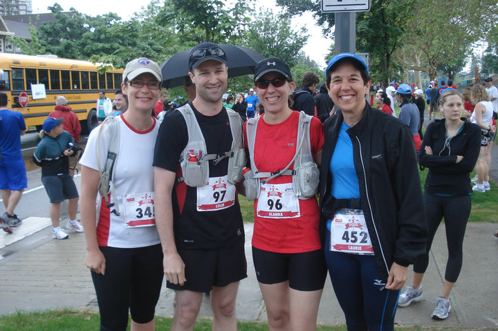 We met up with our carpool (the wonderful Herb, who drove us even though he was injured and no longer running, Allison and Laurie) at our local running store at 5:30am. It was about a 45 minute drive out to the race course and we had our fingers crossed that the rain shower we passed through would turn back to drizzle. We got a fairly close parking spot on the street and got our stuff together. We all look cheerful, but that was more race-day anticipation than anything… it was cold. As we were heading to the starting area we met up with James and his wife and commiserated about the weather – and, yes, James, I did say that my legs looked like plucked chickens (I had a severe case of goose-bumps)!