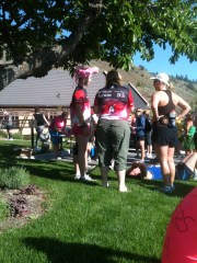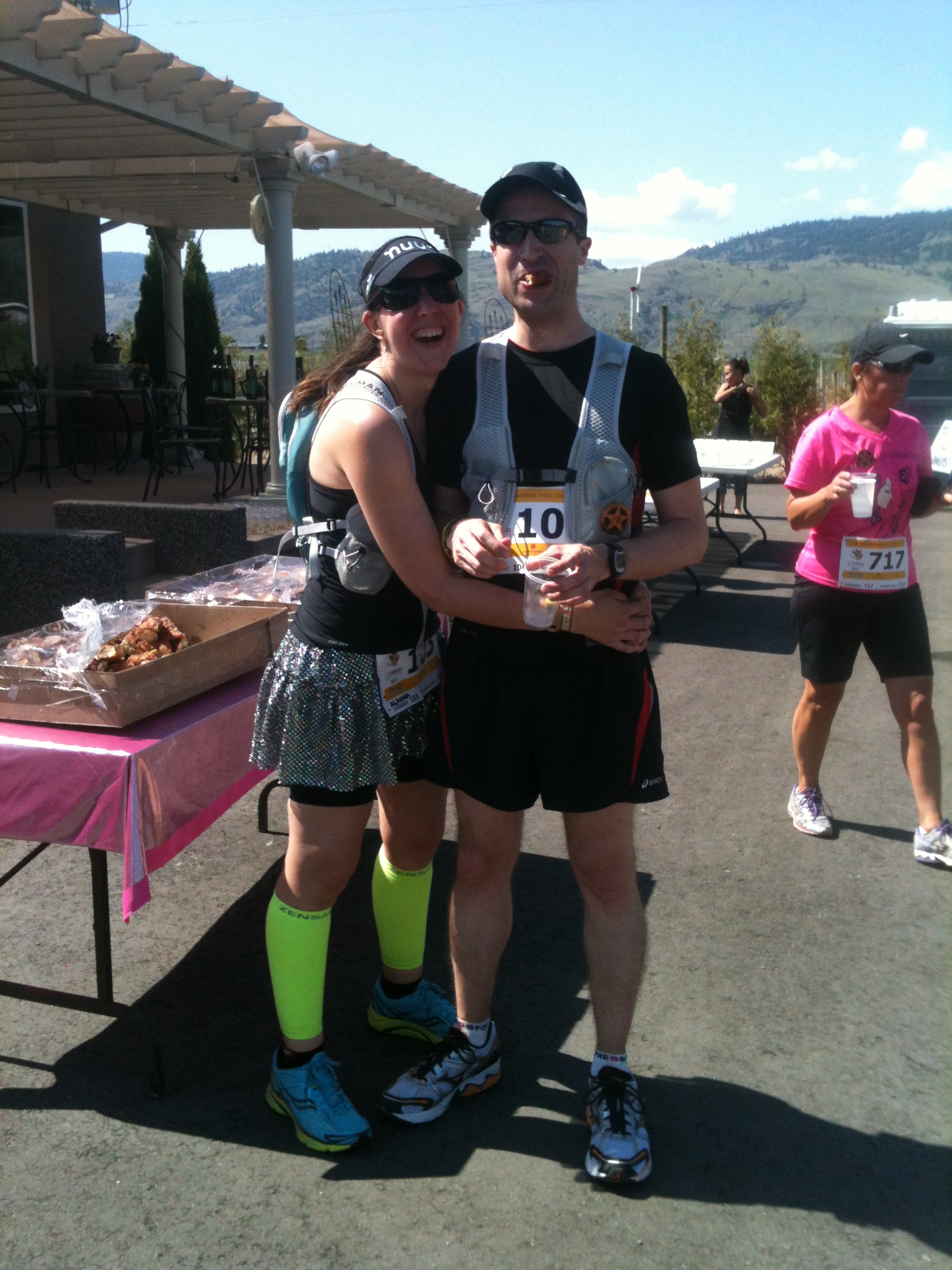 It was nice to get back down into Oliver and know the finish line was near! I didn’t make Colin cross the line holding hands (I should have) and we finished in just over 3 hours. Honestly it was the slowest, most relaxed, fun race we’ve done. After finishing we got commemorative wine glasses instead of medals (we also got a bottle of wine with each of our race packages) – with drink tickets for more tastings from wineries not on the route – and a decent bag lunch of a sandwich, salad, fruit, and dessert. We met up with our friend Laurie to eat and to catch up. Since it was getting pretty hot we headed our separate ways.