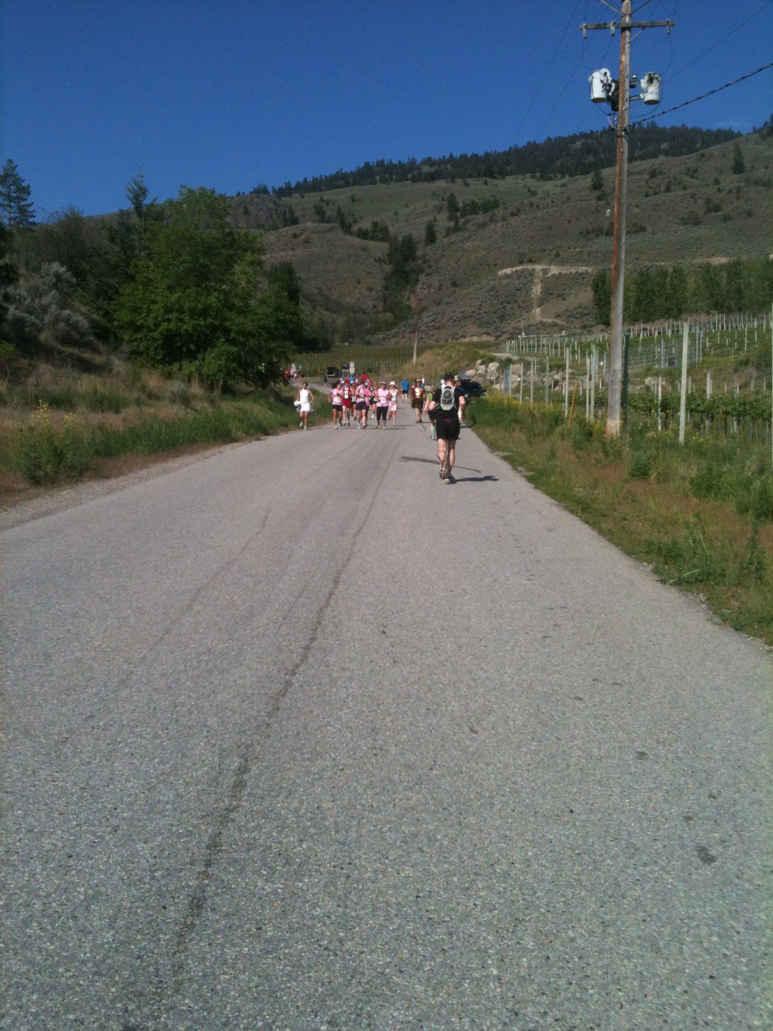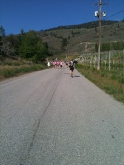 The stretch after Oliver Twist was a little rough. Not only did I have a food rock in my stomach, but I realized that I’d neglected to drink water at the last 2 wineries. Oops! Good thing refreshments were close at hand (unfortunately, though, coming right before a monster hill). We were treated to Sangria and cucumber gazpacho by Tinhorn. Again, not runner fare usually, but so welcome. I made sure to drink plenty of water as well. We ran a little bit more together until Colin told me he had itchy legs. I guess that’s what happens when you run slower than usual. Not that I’d know. So he took off and horrified all the people who elected to walk up the hill.