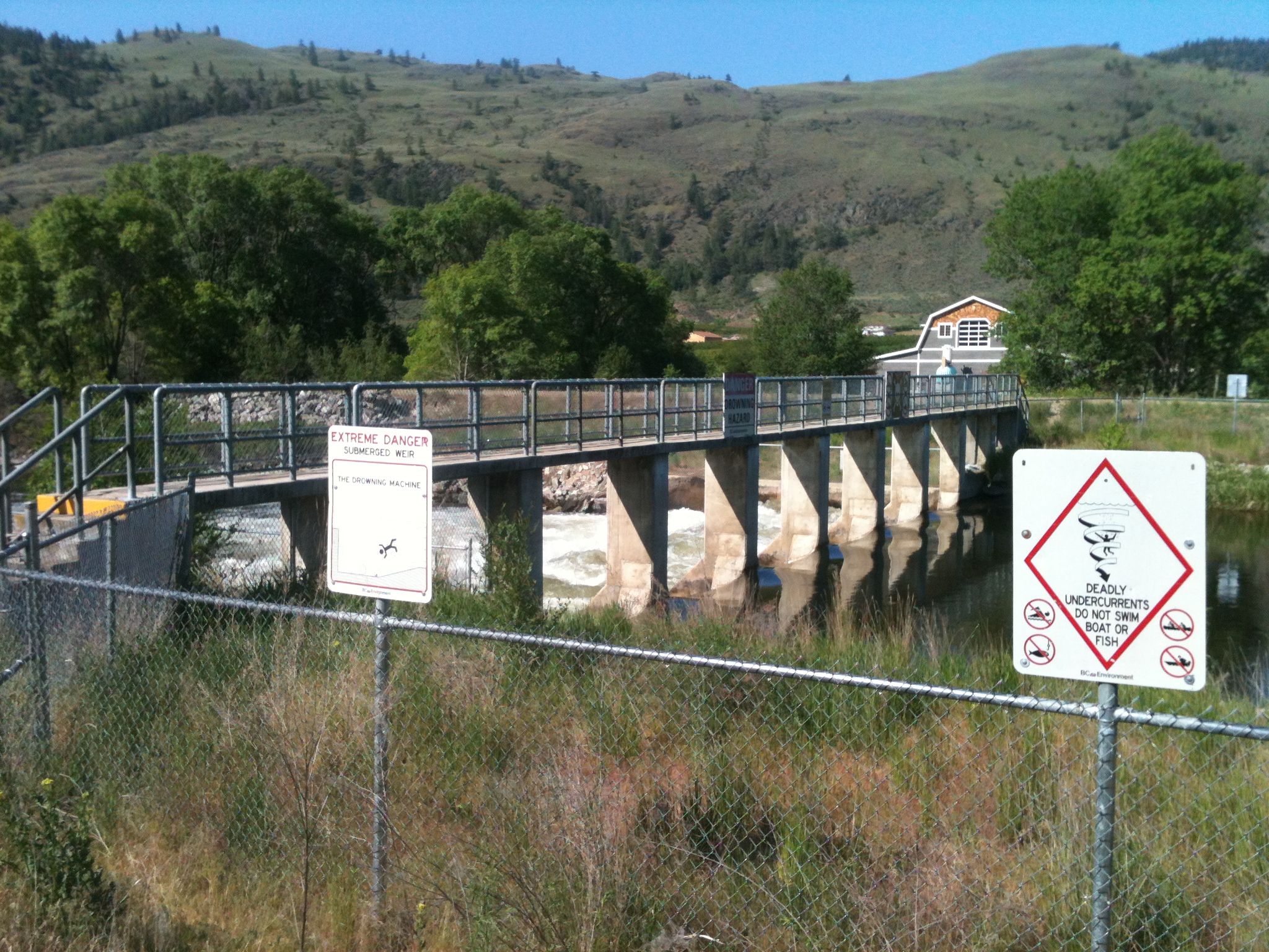 After Rustico we crossed the highway (thank goodness for traffic controllers – stop & go people – so we didn’t get smucked) and had a bit of a run til the next break. It was along a shaded path and across the Okanagan River. You can’t really see it in the left sign, but it says “The Drowning Machine” in reference to the weir.