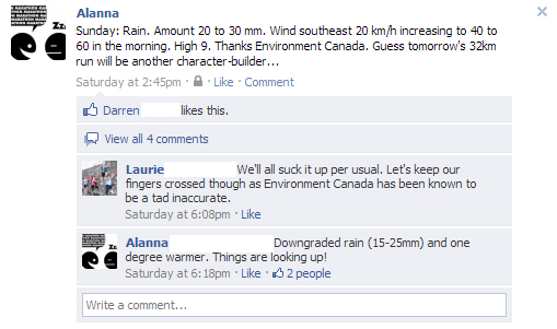 The Environment Canada weather person is a total liar! A couple of days ago we were supposed to have a lovely sunny Sunday for our long run, but as of today the next week looks like this: