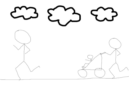 I told Colin to remind me to bring the camera so I had proof of running, but that didn’t pan out. I barely got out the door due to my cold, we left later than we should have, and well, we have a 3 year old. The camera was on the bottom of my list and I’m pretty sure Colin had forgotten altogether. Here is my feeble artist’s rendering of our run.