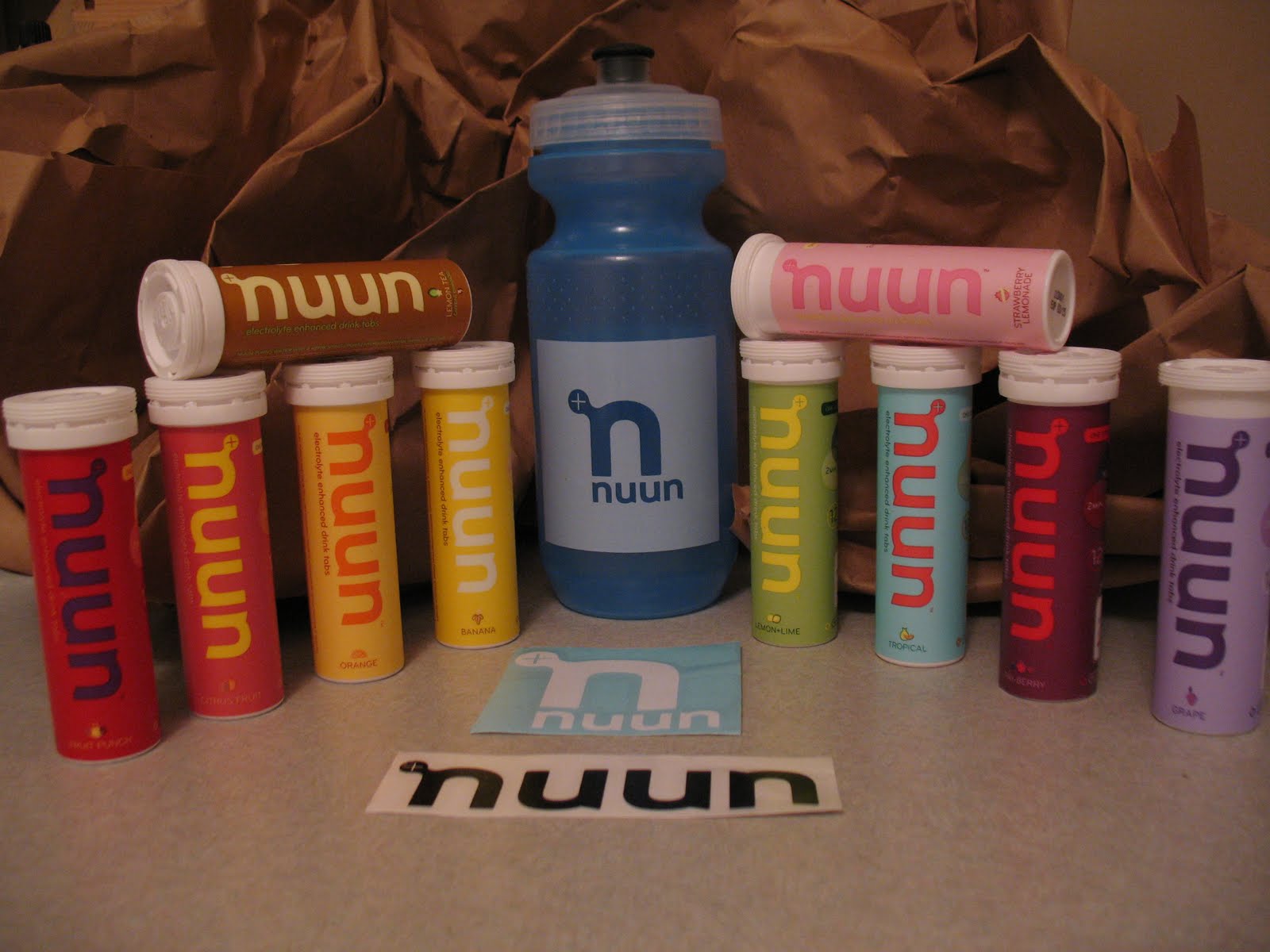After sort of complaining yesterday morning about not receiving my Nuun gift pack yet it came in the afternoon. Score! I actually got a few more stickers and another bottle, but the bottle was put to use right away. Strawberry Lemonade and Grape were my first trials. I put too much water in the first one, but it was still good. I tried to smell it right after taking off the cap and ended up snorting a bunch of powder. Oops…
